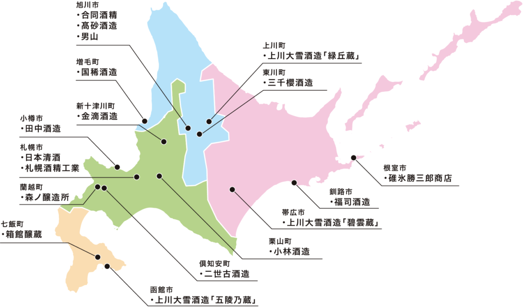 リンク 組合参画企業 道央 森ノ醸造所二世古酒造田中酒造日本清酒札幌酒精工業金滴酒造小林酒造 道北 国稀酒造合同酒精髙砂酒造男山三千櫻酒造上川大雪酒造・緑丘蔵 道南 箱館醸造上川大雪酒造・五稜乃蔵 道東 福司酒造碓氷勝三郎商店 上川大雪酒造・碧雲蔵 関連団体 日本酒造組合中央会 [北海道] 北海道酒造組合 [北陸] 富山県酒造組合石川県酒造組合連合会福井県酒造組合 [四国] 徳島県酒造組合香川県酒造組合愛媛県酒造組合高知県酒造組合 [東北] 青森県酒造組合岩手県酒造組合宮城県酒造組合秋田県酒造組合山形県酒造組合福島県酒造組合 [東海] 愛知県酒造組合岐阜県酒造組合連合会静岡県酒造組合三重県酒造組合 [九州] 福岡県酒造組合佐賀県酒造組合長崎県酒造組合熊本県酒造組合連合会大分県酒造組合宮崎県酒造組合鹿児島県酒造組合 [関東] 東京都酒造組合連合会神奈川県酒造組合埼玉県酒造組合千葉県酒造組合茨城県酒造組合栃木県酒造組合群馬県酒造組合 [近畿] 大阪府酒造組合兵庫県酒造組合連合会京都府酒造組合連合会滋賀県酒造組合奈良県酒造組合和歌山県酒造組合連合会 [沖縄] 沖縄県酒造組合 [甲信越] 山梨県酒造組合新潟県酒造組合長野県酒造組合 [中国] 鳥取県酒造組合島根県酒造組合岡山県酒造組合広島県酒造組合山口県酒造組合
