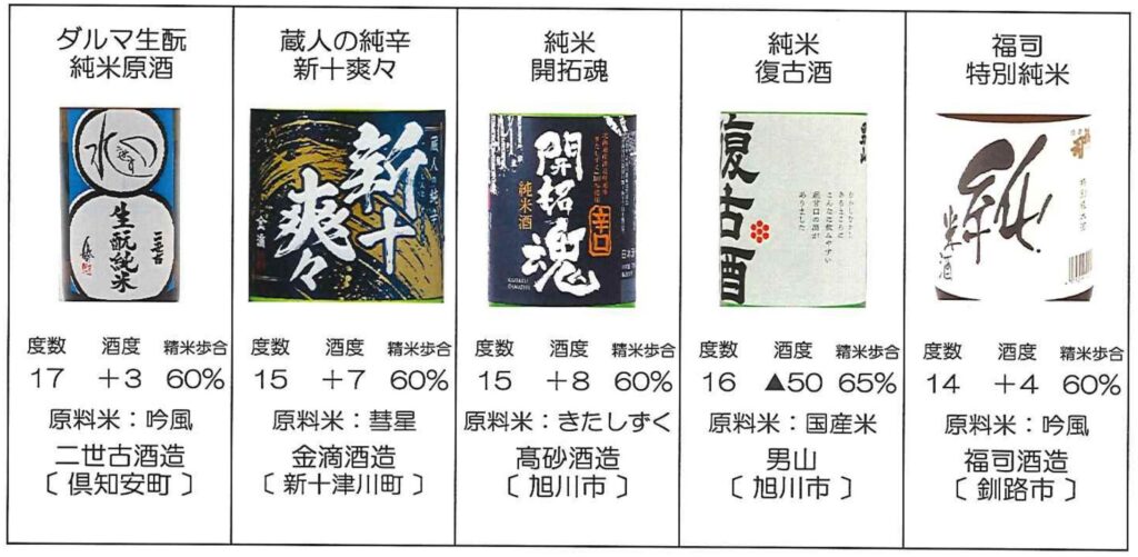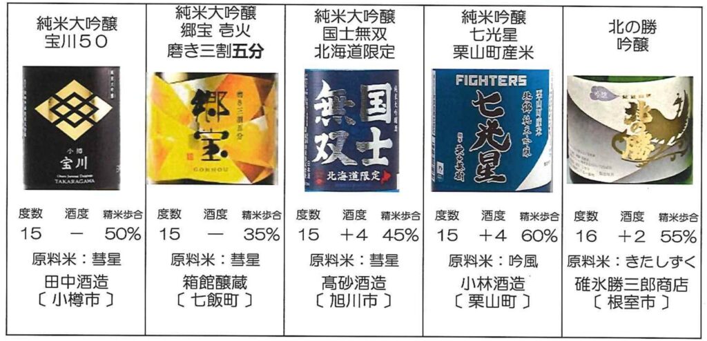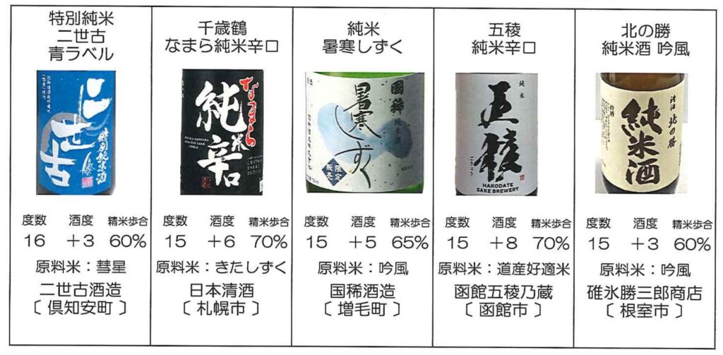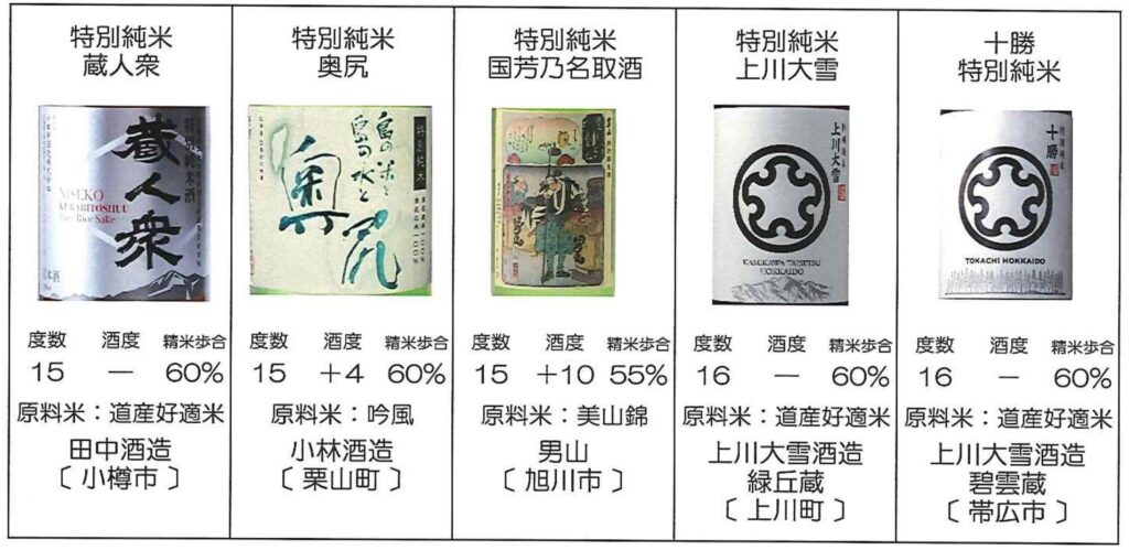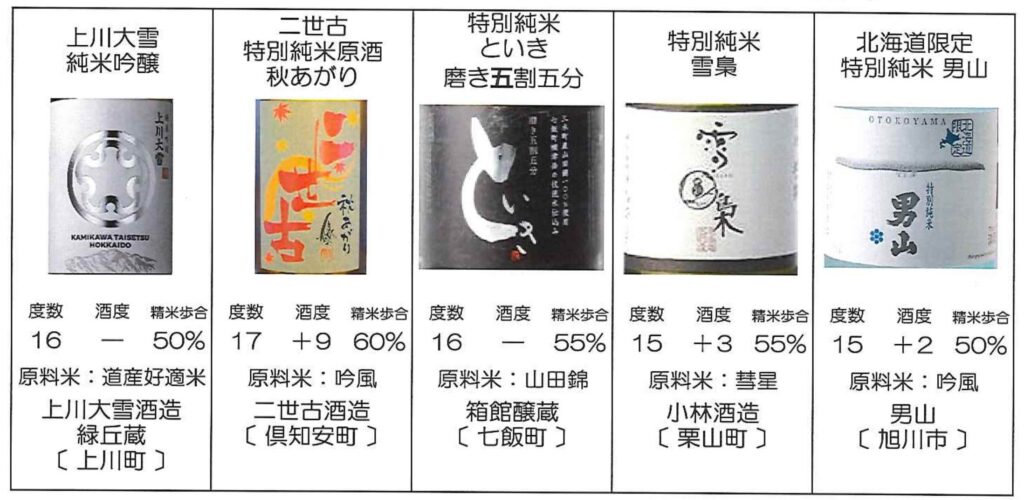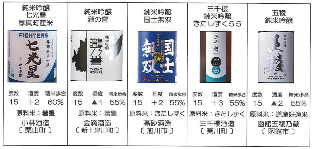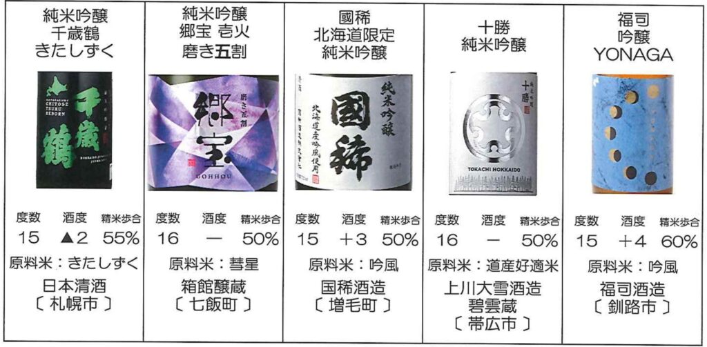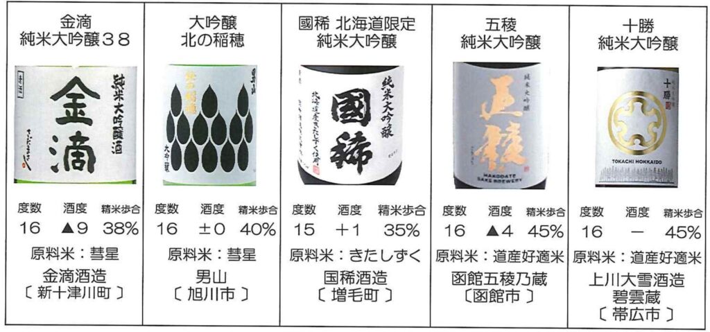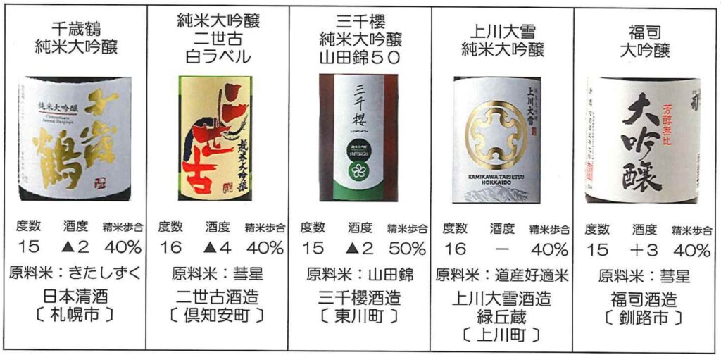飲み比べセットは北海道内の14組合員が北海道産酒造好適米「吟風」「彗星」「きたしずく」などを使用して醸造した大吟醸酒、吟醸酒、純米酒等の飲み比べ5本(720ml詰)セット、9種類となっています。