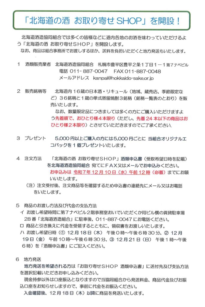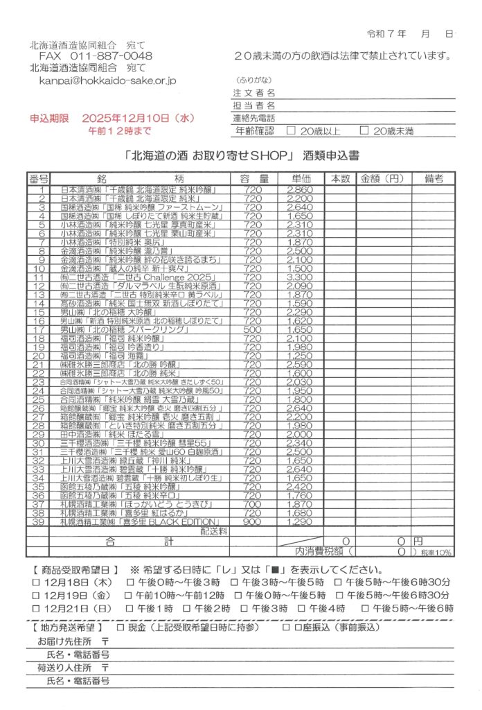 お申込は「北海道の酒 お取り寄せSHOP」酒類申込書(受取希望日時を記載)を 令和7年12月10日(水)午前12時(必着)まで に北海道酒造協同組合宛てにFAX(011-887-0048)又はメール(info@hokkaido-sake.or.jp)でお申し込みください。
