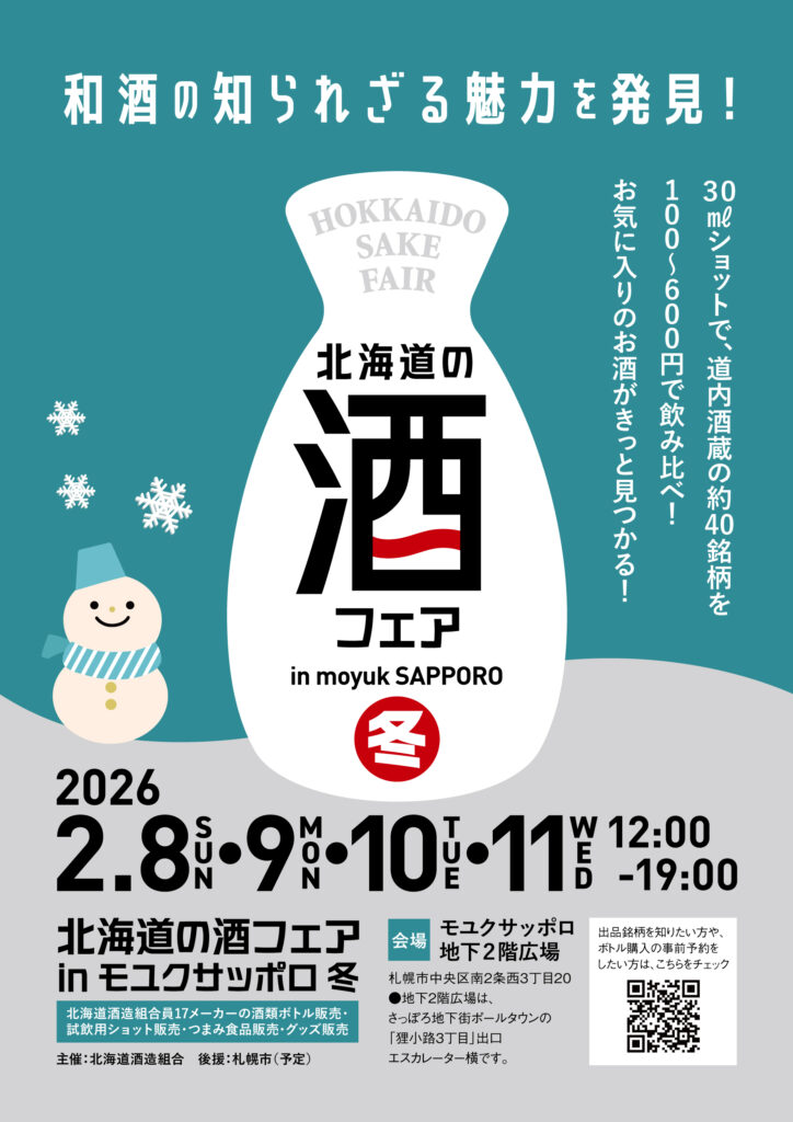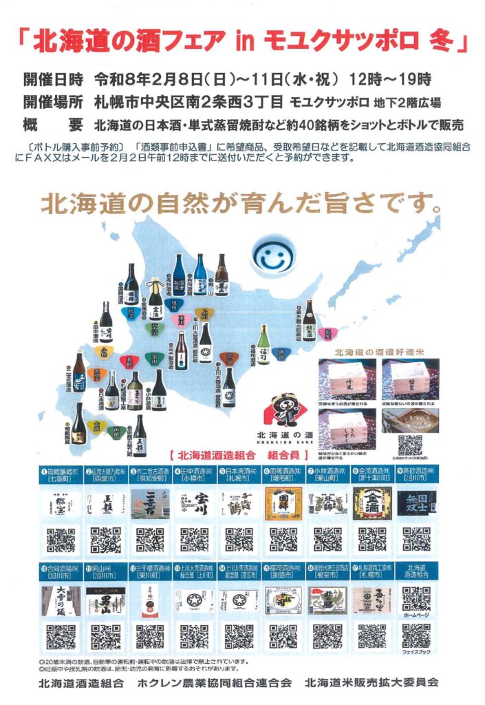 北海道酒造組合では、さっぽろ雪まつり開催に合わせ「北海道の酒フェア in モユクサッポロ 冬 」を2月8日(日)から11日(水・祝)までの4日間、札幌市中央区南2条西3丁目 モユクサッポロ 地下2階広場で開催いたします。