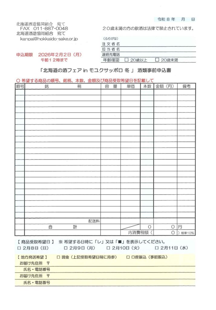 お申込は「酒類事前申込書」に順号、銘柄、金額、本数、受取希望日などをご記入いただき北海道酒造協同組合宛てにFAX(011-887-0048)又はメール(kanpai@hokkaido-sake.or.jp)でお申し込みください。