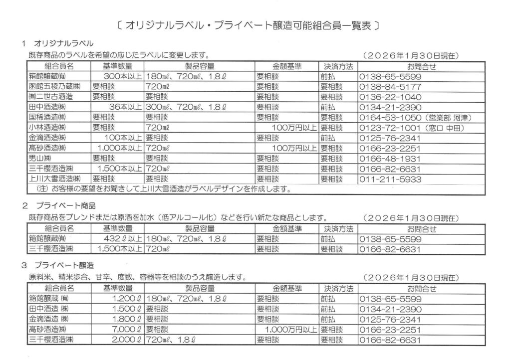 プライベート商品:酒蔵の商品をブレンド又は原酒を加水して低アルコールにするなどして新たな商品(ラベルも作成)とします。