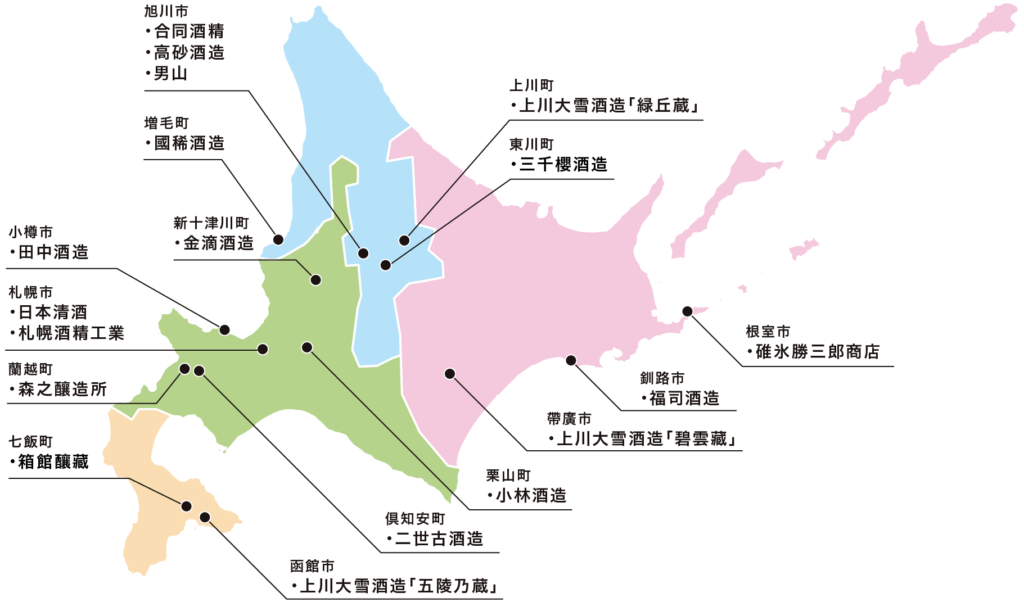 連結 工會參與企業 道央 森之釀造所二世古酒造田中酒造日本清酒札幌酒精工業金滴酒造小林酒造 道北 國稀酒造合同酒精高砂酒造男山三千櫻酒造上川大雪酒造・緑丘蔵 道南 箱館釀藏上川大雪酒造・五稜乃藏 道東 福司酒造碓氷勝三郎商店上川大雪酒造・碧雲藏 相關團體 日本酒造工會中央會 [北海道] 北海道酒造工會 [北陸] 富山縣酒造工會石川縣酒造工會聯合會福井縣酒造工會 [四國] 德島縣酒造工會香川縣酒造工會愛媛縣酒造工會高知縣酒造工會 [東北] 青森縣酒造工會岩手縣酒造工會宮城縣酒造工會秋田縣酒造工會山形縣酒造工會福島縣酒造工會 [東海] 愛知縣酒造工會岐阜縣酒造工會聯合會靜岡縣酒造工會三重縣酒造工會 [九州] 福岡縣酒造工會佐賀縣酒造工會長崎縣酒造工會熊本縣酒造工會聯合會大分縣酒造工會宮崎縣酒造工會鹿兒島酒造工會 [關東] 東京都酒造工會聯合會神奈川縣酒造工會埼玉縣酒造工會千葉縣酒造工會茨城縣酒造工會栃木縣酒造工會群馬縣酒造工會 [近畿] 大阪府酒造工會兵庫縣酒造工會聯合會京都府酒造工會聯合會滋賀縣酒造工會奈良縣酒造工會和歌山酒造工會聯合會 [沖繩] 沖繩縣酒造工會 [甲信越] 山梨縣酒造工會新潟縣酒造工會長野縣酒造工會 [中國] 鳥取縣酒造工會鳥根縣酒造工會岡山縣酒造工會廣島縣酒造工會山口縣酒造工會